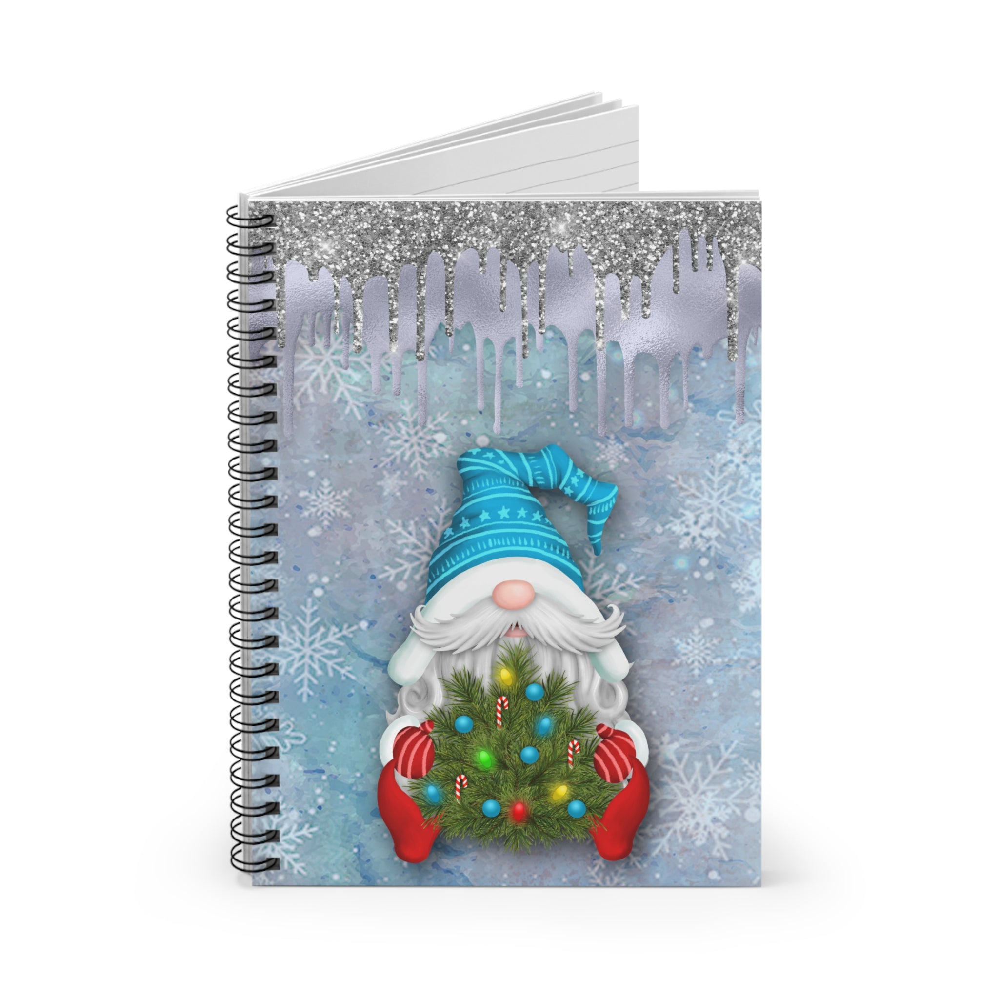 Christmas journal gift/ diary spiral notebook featuring a watercolor smiling snowman with red mittens, scarf and hat holding holiday lights set on a wintery snow background.