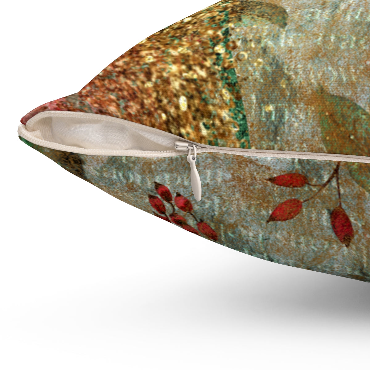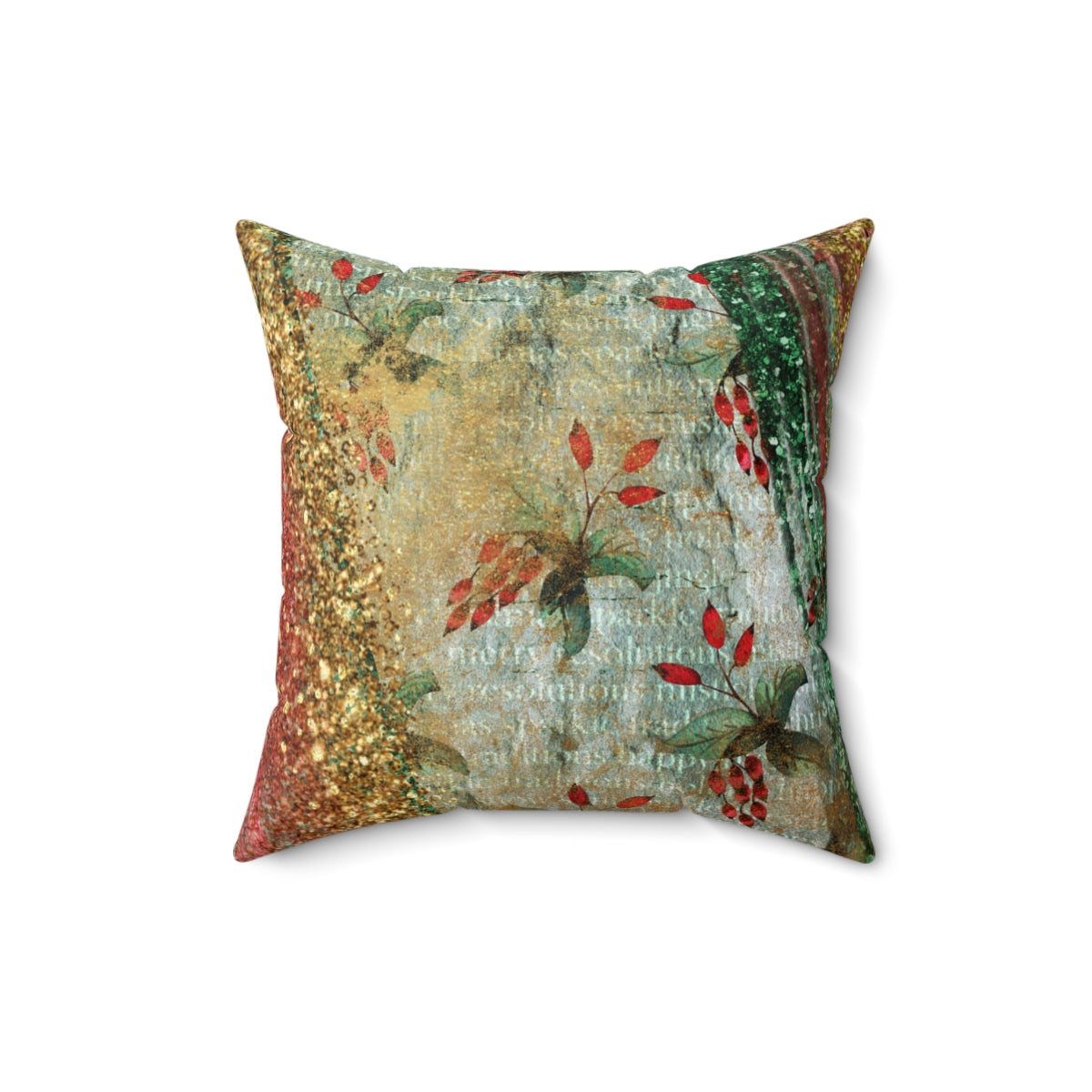 Christmas pillow featuring a distressed poinsettia and winter typography pattern with glam red, emerald green and gold glitter imaged brush strokes.