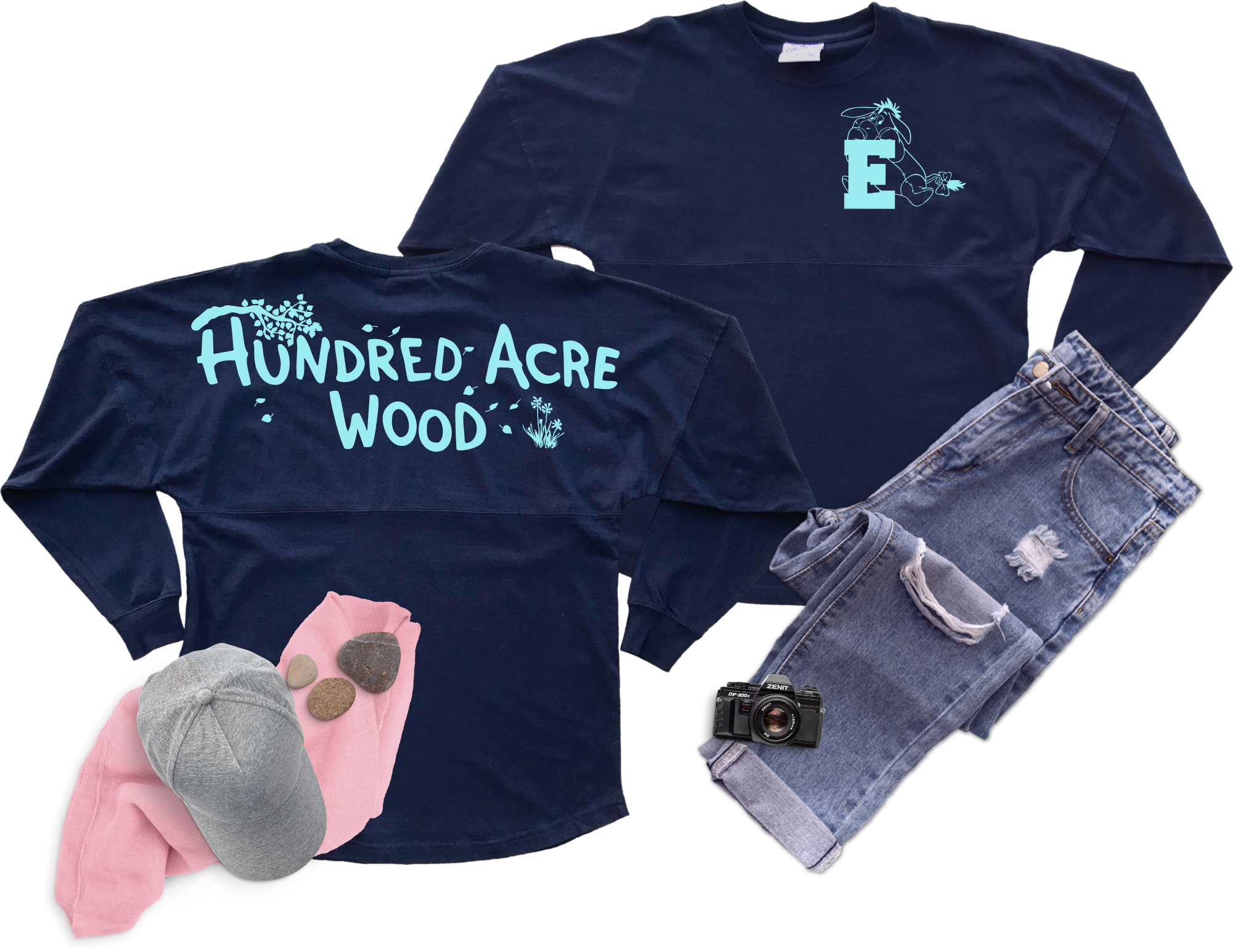Winnie The Pooh jersey/ Eeyore spirit shirt featuring Hundred Acre Wood with tree leaves and flowers on back and Eeyore on front crest. Dark colored jerseys will have light blue printing and light colored jerseys will have navy blue printing. This design is not customizable in art or text.